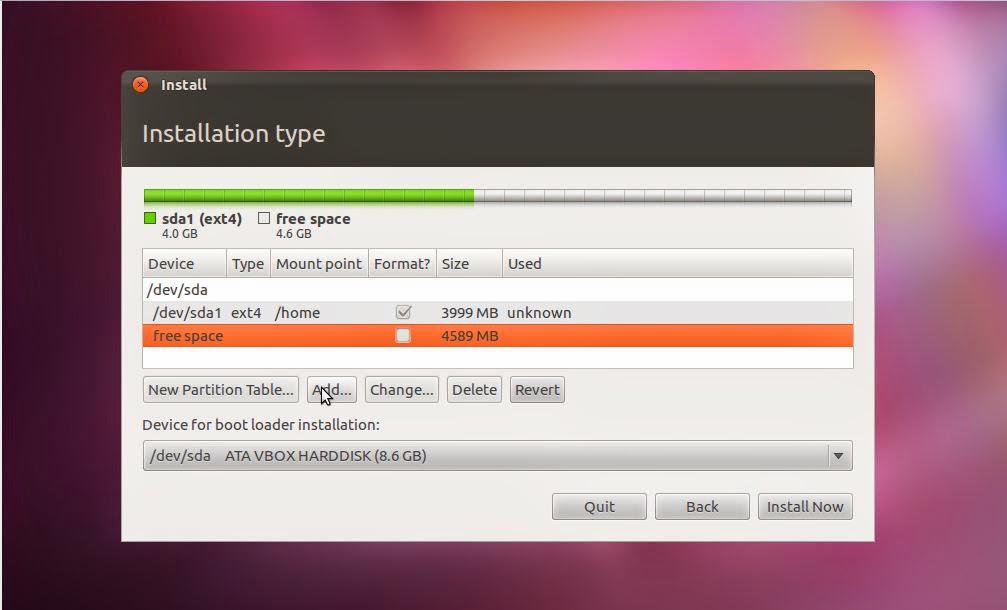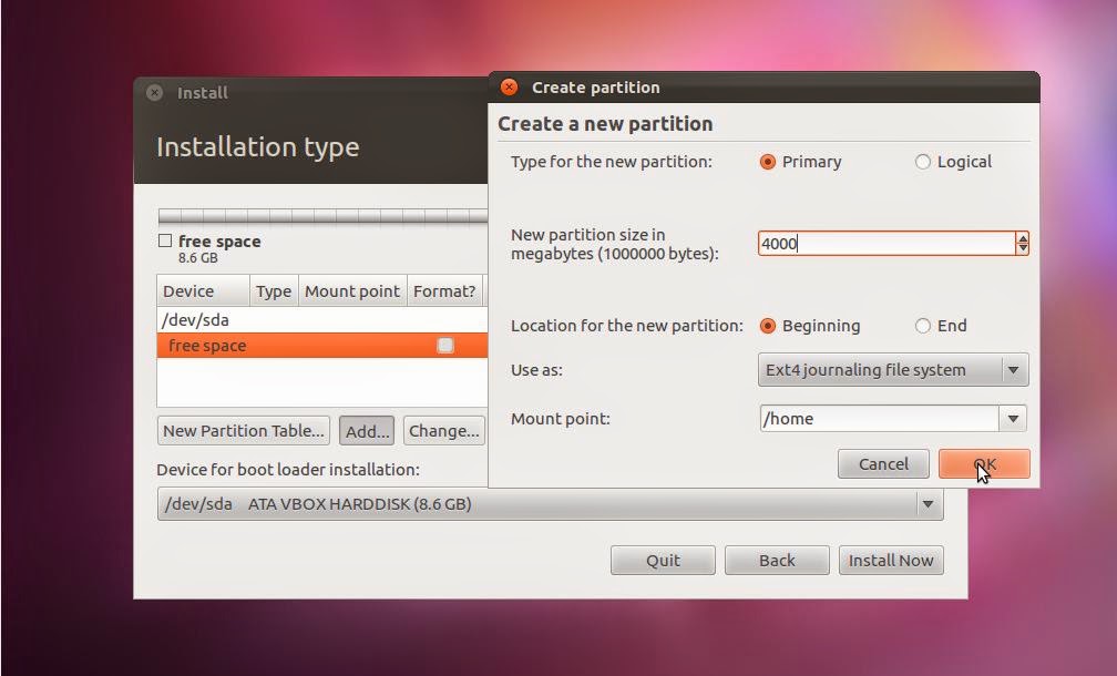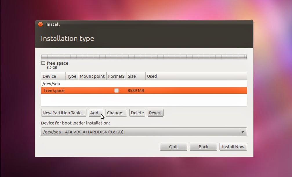 Setelah jadi format partisi Home sekarang kita akan membuat format partisi untuk tempat instalasi seperti gambar dibawah ini, lalu klik add. (lihat gambar 8)