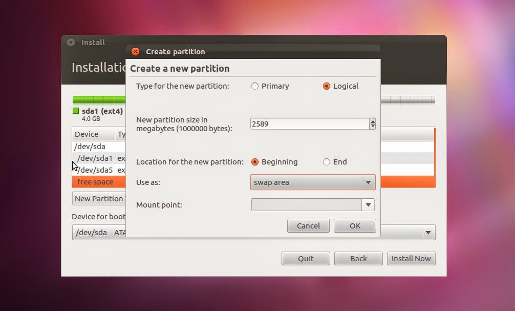 Sekarang kita akan membuat swap area yang merupakan sebagai virtual memory. Fungsi Swap pada sistem operasi Linux (baik ubuntu, BlankOn,dll) adalah untuk memberikan dukungan pada memory fisik (Random Acces Memori (RAM)) pada komputer kita. “Apabila memory utama pada komputer. (lihat gambar 10)