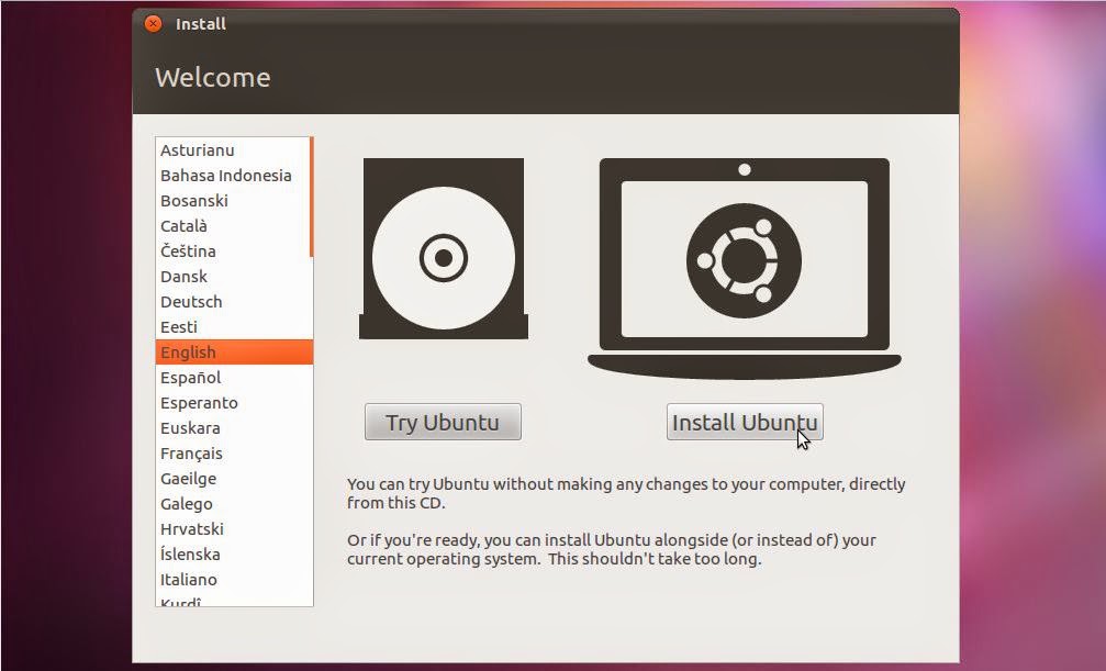 - Klik Try Ubuntu jika ingin mencoba melalui live cd tanpa harus memasang ke PC.