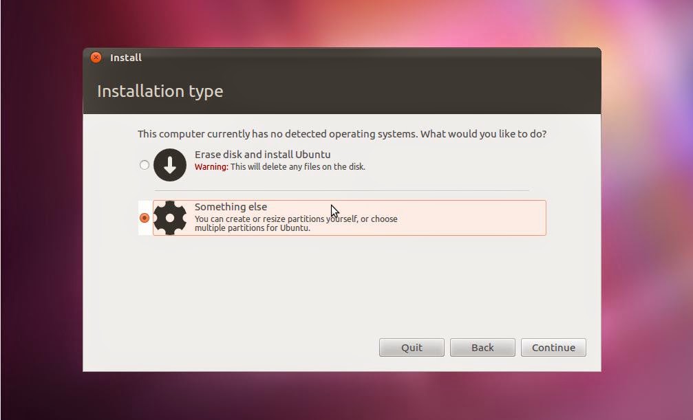 Pada bagian ini ada dua opsi yaitu 1. Erase disk and install ubuntu dan 2. semething else