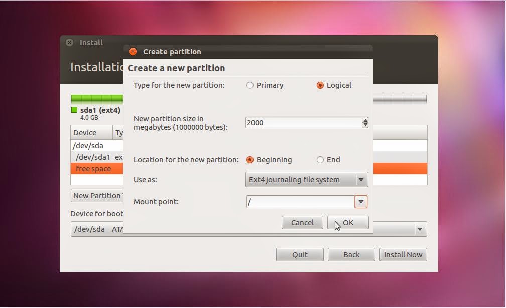 Masukan nilai partisi yang ingin kita gunakan, pada bagian ini penulis memasukan nilai 4000 MB atau setara dengan 4 GB untuk di jadikan primary (partisi utama).