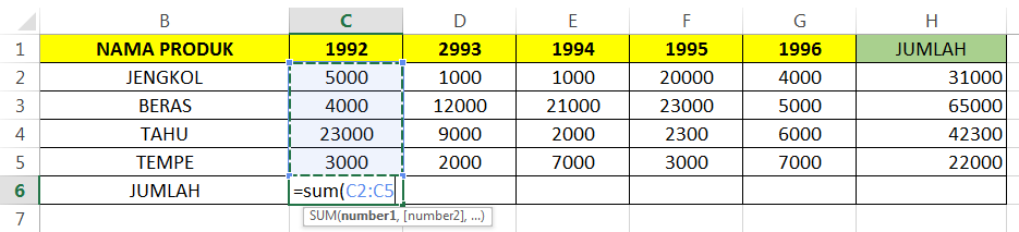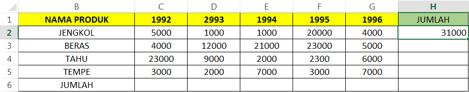 Sekarang kita akan menjumlahkan pada bagian kolom H baris 2 (cell H2) klik sel tersebut dan masukan rumusnya seperti gambar berikut
