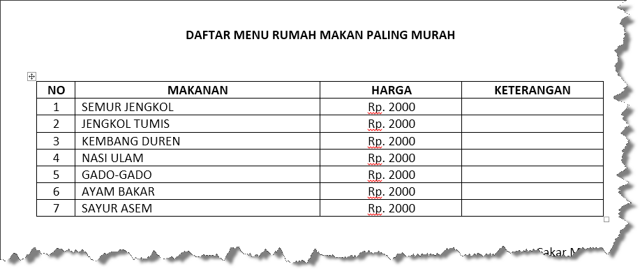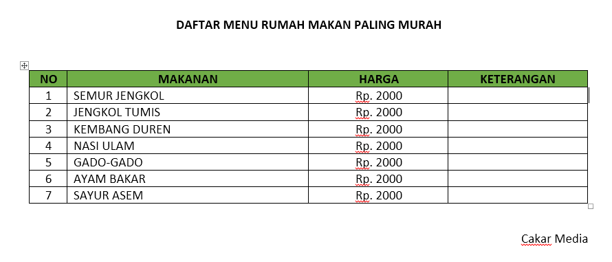 setelah tabel sudah terbentuk, sekarang kita input beberapa isi dari tabel, contohnya. No, Nama Makanan, harga dan keterangan.