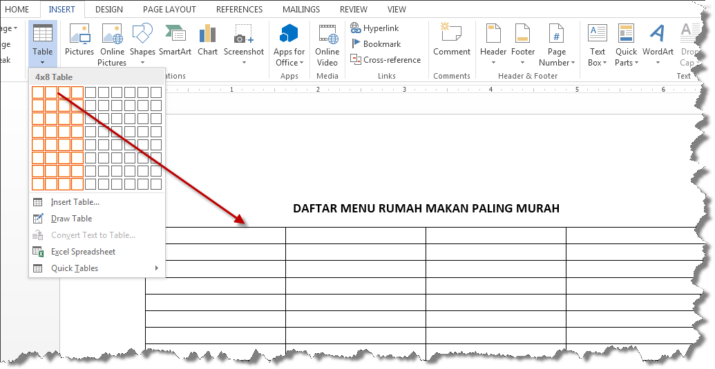 Table, disini saya menggunakan Office 2013. masukan tabel sesuai dengan kebutuhan anda, jika mengacu pada gambar tabel diatas saya menggunakan kolom sebanyak 4 kolom, dan baris sebanyak 8 Row.