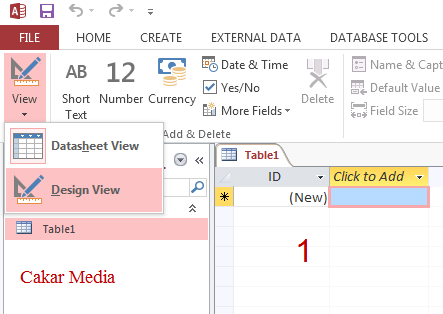 klik menu View lalu pilih Design View, setelah itu simpan nama Tabelnya contoh "data_siswa" tanpa tanda kutip.