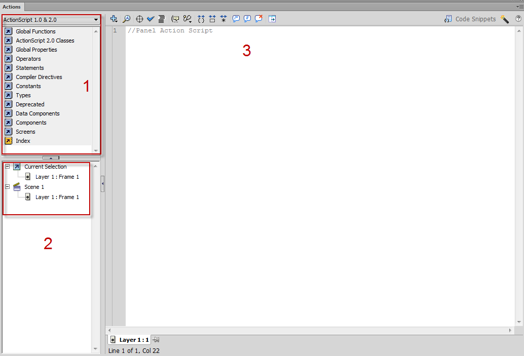 Panel Action Script merupakan tempat dimana kita bisa menuliskan koding-koding perintah di Flash yang dilengkapi beberapa fasilitas tersendiri.