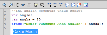 - Warna merah : merupakan kata kunci otomatis yang telah di cadangkan oleh Flash misalnya pada tilisan (var)