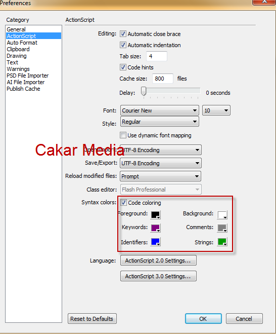 Untuk lebih jelasnya bias lihat di Syntax Coloring pada flash dengan menekan tombol kombinasi CTRL + U, pada bagian ini anda juga dapat mengubah warna sesuai dengan keinginan anda.