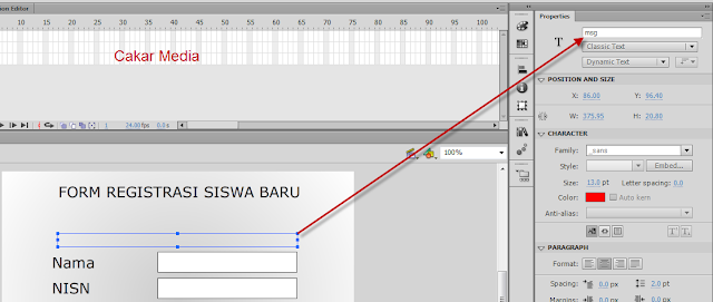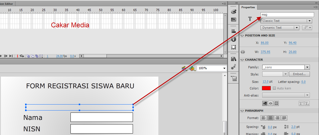 berikutnya buatlah dynamic text pada bagian atas form yang fungsinya untuk notifaksi pesan jika ada kesalahan dan beri nama instance "msg" tanpa tanda kutip