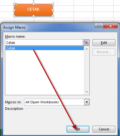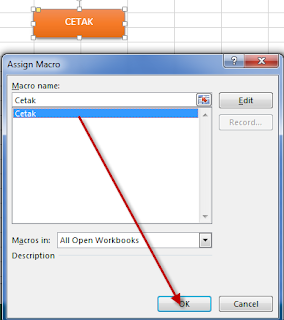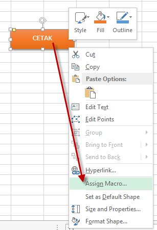 Berikutnya kembali ke lembar kerja excel kita, dan kita fokus ke tombol yang sudah kita buat tadi, klik kanan tombolnya lalu pilih Assign Macro.