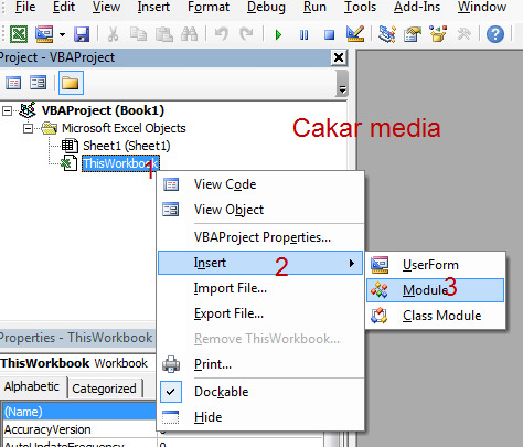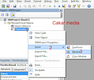 Okeh, berikutnya masuk ke area Macro VB Project, dengan cara menekan tombol ALT+F11, jika sudah terbuka klik kanan pada bagian this workbook pilih insert lalau pilih module.