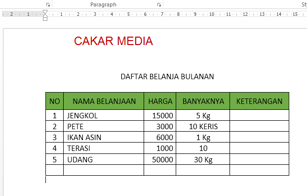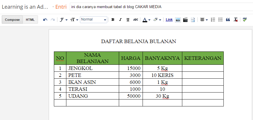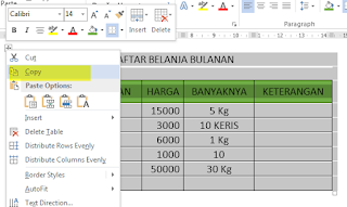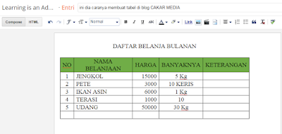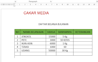 Hallo sobat Muda Cakar Media..kali ini saya akan bagi pengalaman pada saat awal menggunakan blog, yaitu pengalaman kesulitan membuat tabel pada postingan blog, akhirnya ketemu juga caranya setelah bolak balik ke blog tetangga,hehe.. nah buat para pemula yang merasa kesulitan atau kebingungan caranya sebenarnya sangat mudah, kita bisa memanfaatkan membuat tabel dari program Excel maupun Word, Ok langsung aja. langkah pertama coba anda buat tabelnya di excel atau di word, tapi kali ini saya akan contohkan membuat tabelnya dari Word seperti terlihat di bawah ini :